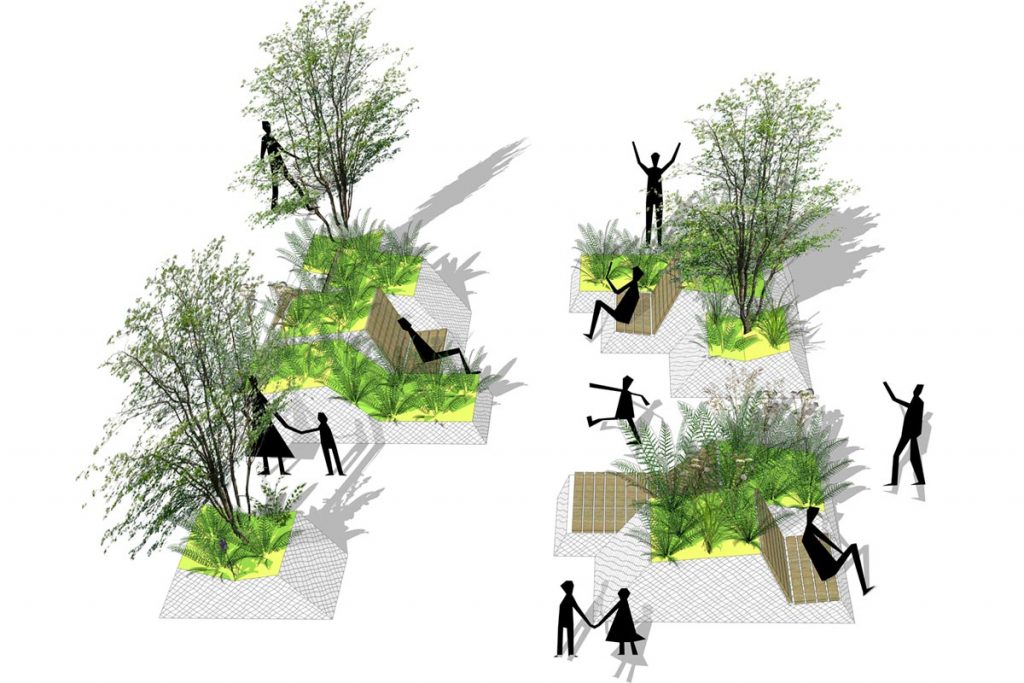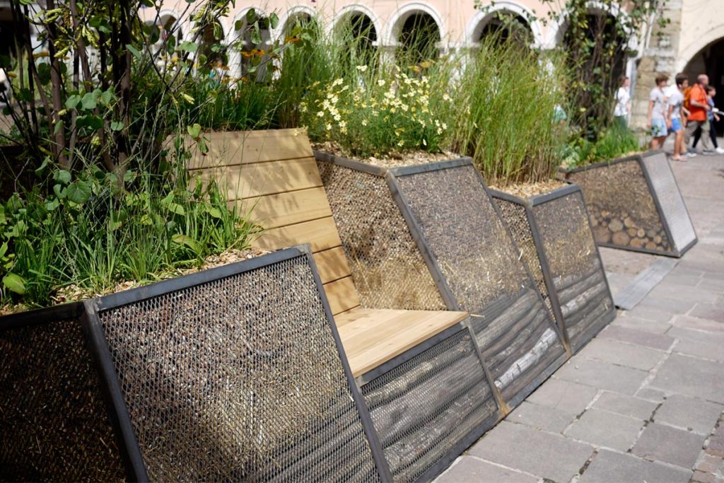 Humus communis est un jardin hors-sol qui contraste avec le caractère minéral de la place Notre Dame de Liesse. Il est une transposition du paysage de la montagne qui domine l’horizon d’Annecy. Son sol fertile est constitué de différentes strates de matières organiques en décomposition contenues dans des structures métalliques. Une végétation alpine s’y développe, en résonance avec la nature environnante. Cet écosystème apporte de l’ombre et de la fraîcheur à la place et devient un lieu d’accueil pour la biodiversité.