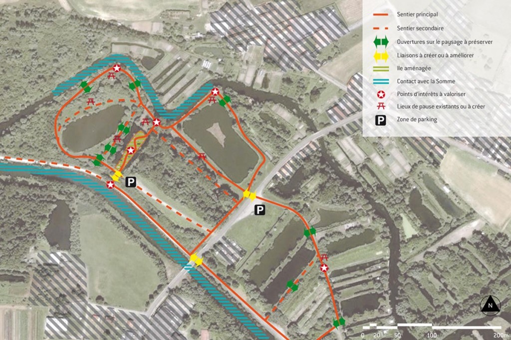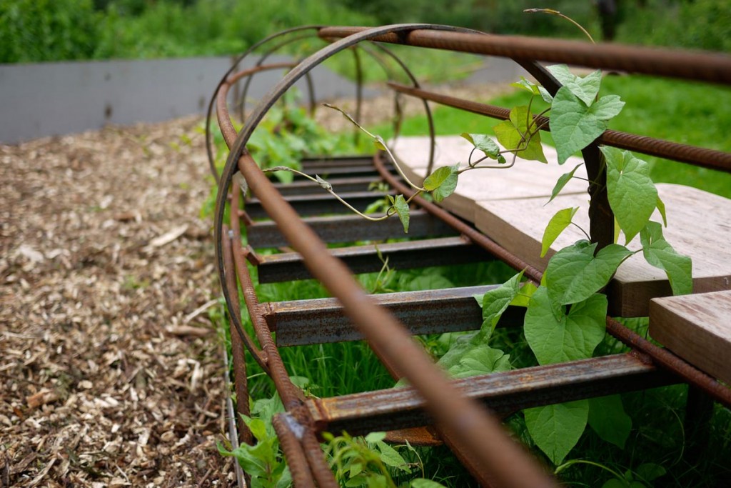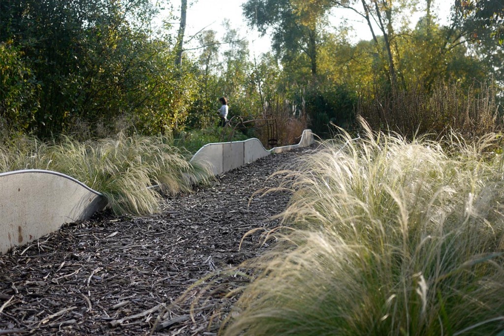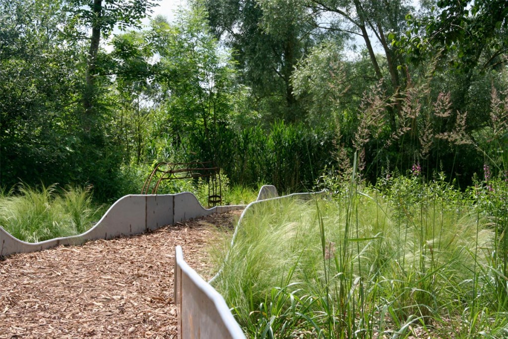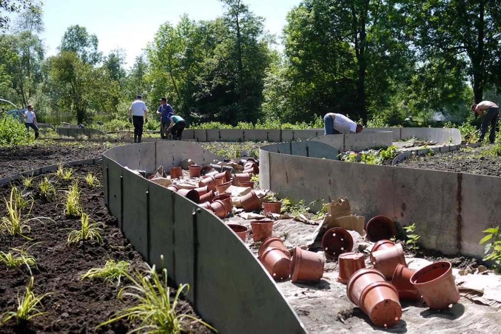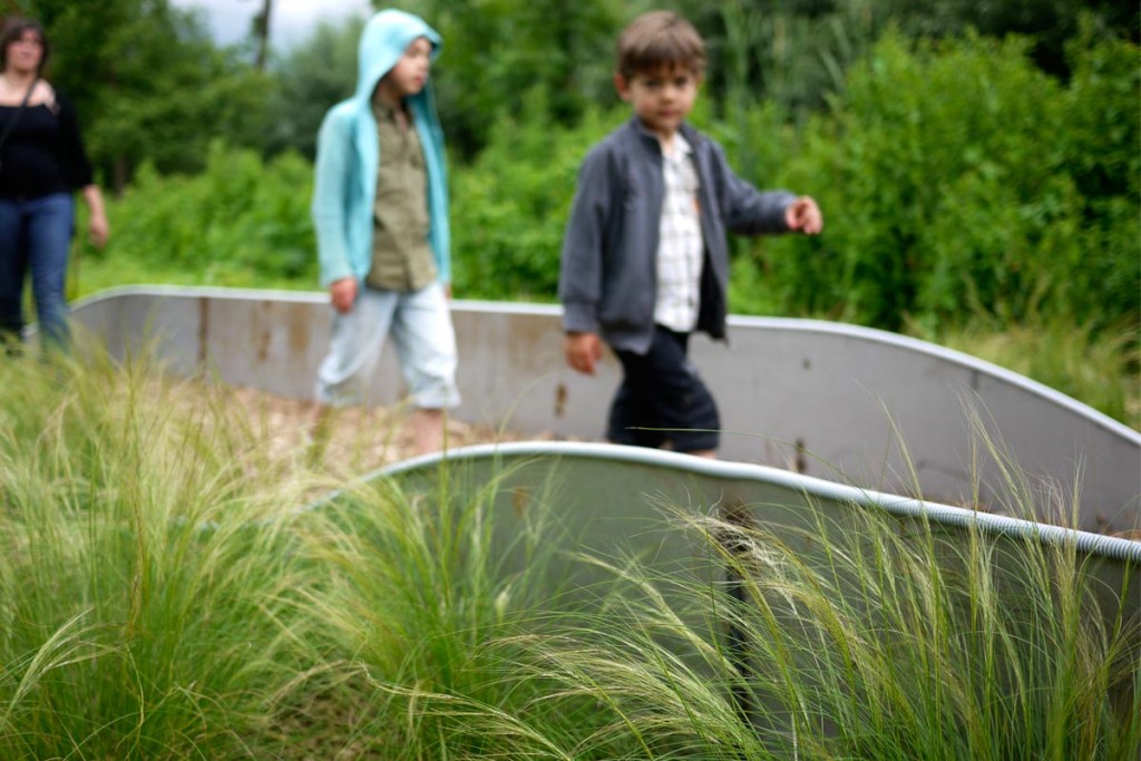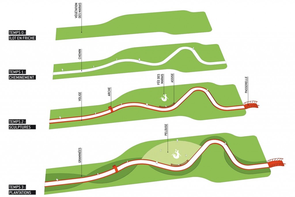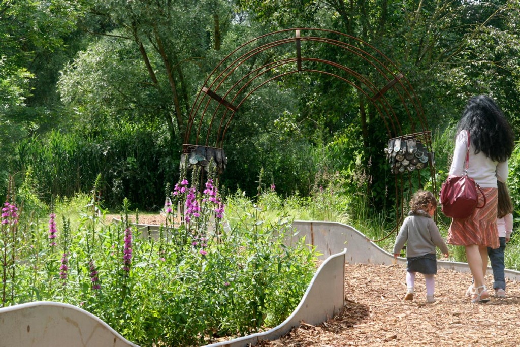 Le paysage local est marqué par la présence de l’eau et par l’activité agricole développée par le passé. Faute d’entretien, ce bocage aquatique s’enfriche. Le Pays Santerre Haute Somme a initié l’évènement “Arts aux jardins” afin de valoriser ce patrimoine, en explorant les mythes des marais. Le projet s’est construit collectivement autour d’ateliers avec les habitants afin d’établir une réflexion sur le territoire et aménager un îlot délaissé. Le dessin du jardin reflète le mouvement d’une anguille. Un chemin sinueux traverse l’îlot, ponctué de graminées, de grimpantes et de la végétation spontanée. L’anguille apparaît, disparaît. Elle devient tour à tour : passerelle, assise, arche, et sculpture s’élevant à 5 mètres de hauteur.