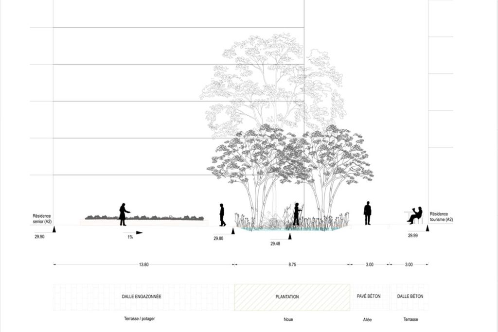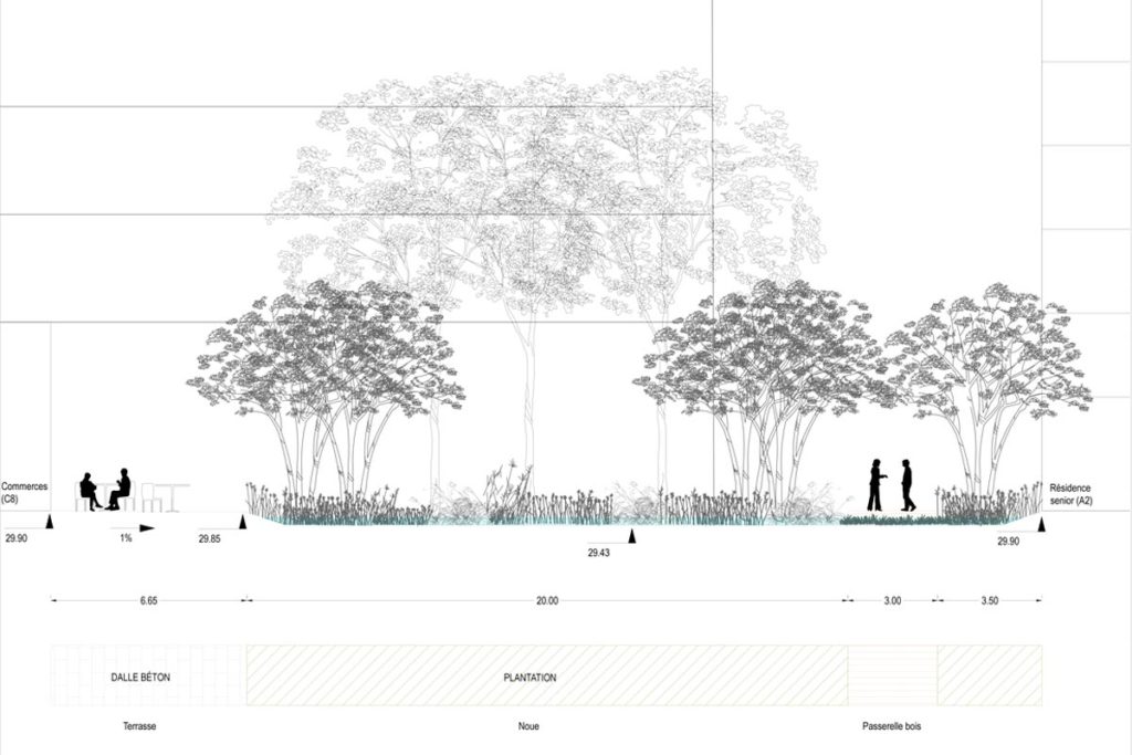 La ZAC Parc d’Affaires s’inscrit dans la stratégie de reconquête des friches industrielles des bords de Seine par la création d’un écoquartier offrant une mixité sociale et urbaine tout en développant différentes strates paysagères : strate résiliente, strate productive et strate de biodiversité. Le coeur d’îlot paysager du lot A2C8 contribue à la mise en place de cette démarche environnementale. Il s’articule autour d’allées piétonnes traversantes plantées de strates végétales permettant de créer des continuités avec le quartier et de renforcer la trame verte. Les espaces en pleine terre assurent quant à eux la gestion des eaux pluviales à ciel ouvert de l’îlot par la mise en place de noues plantées. Des potagers se développent en rez-de-chaussée, en terrasses et sur les toitures.