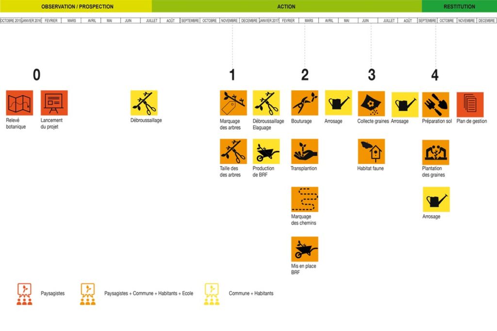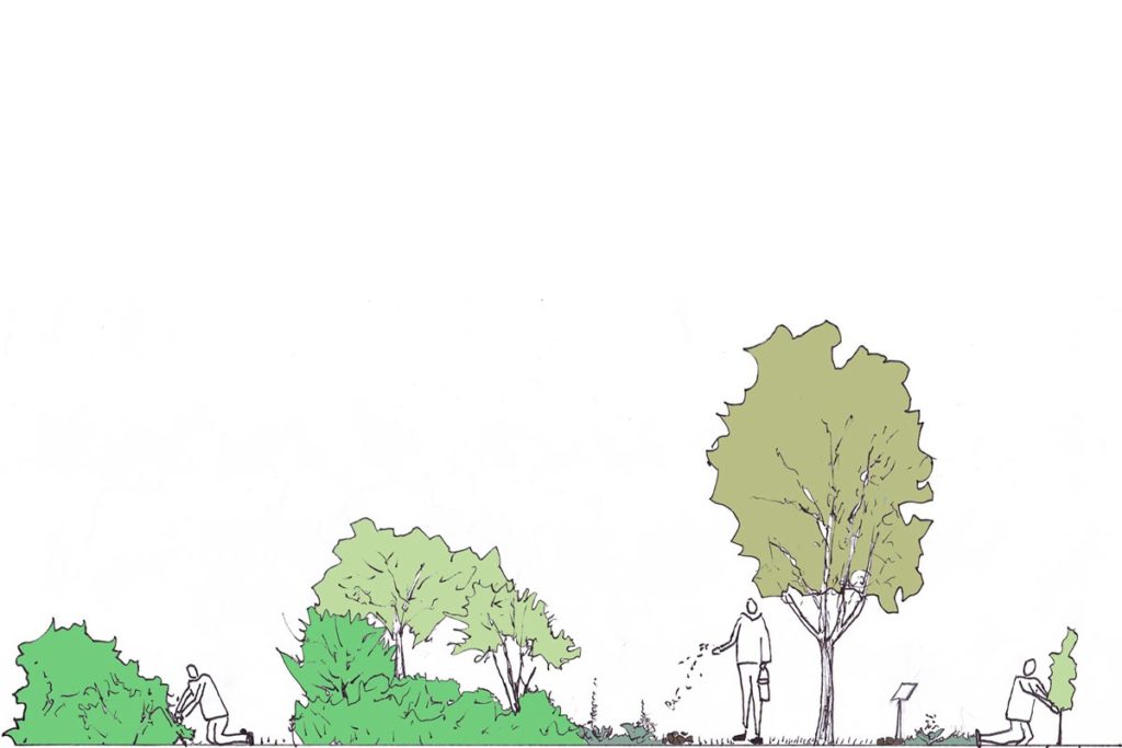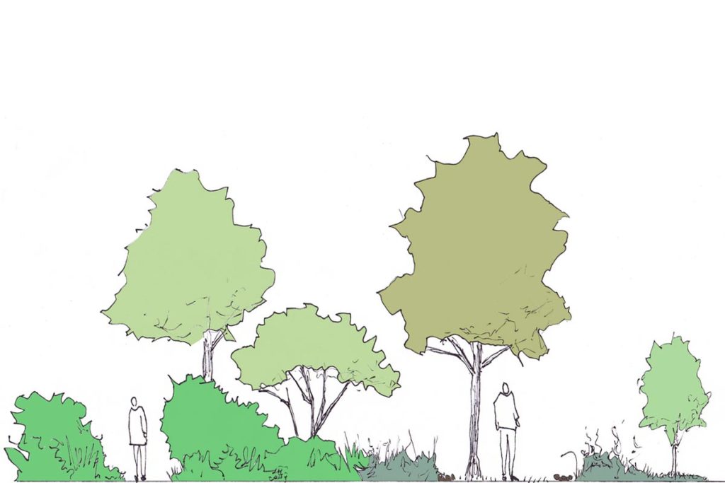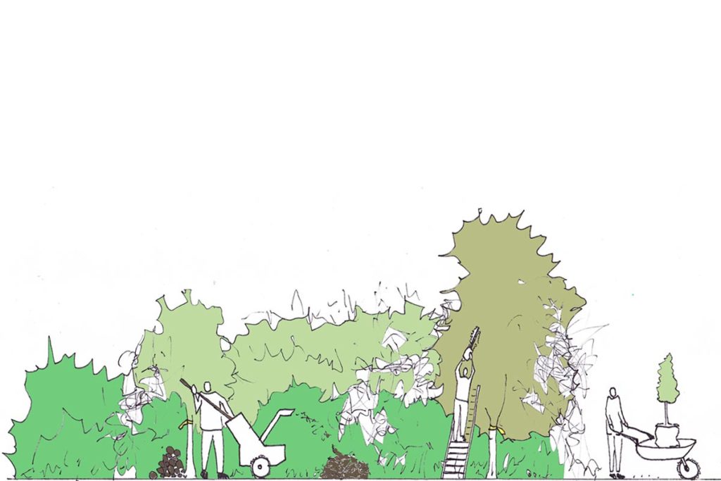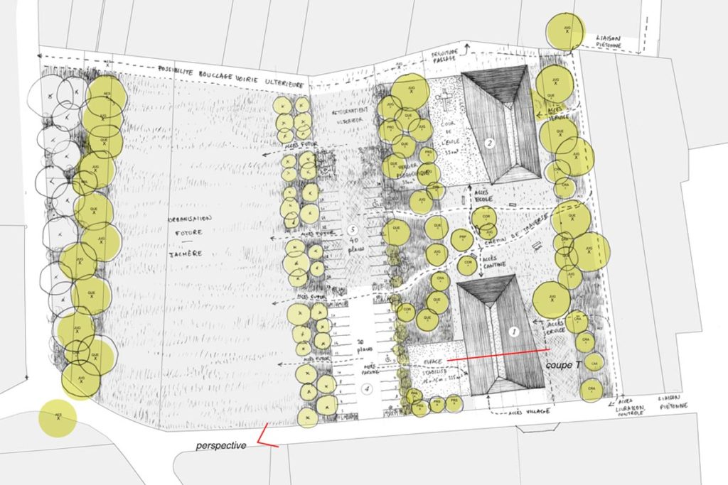 Le site présente une morphologie en lanière, composée de haies à l’état de friche. Ces haies sont ponctuées de nombreux arbres remarquables. Le parti pris est de ménager le site plutôt que de l’aménager. Pour ce faire, nous proposons de conserver la majorité des sujets tout en procédant à leur éclaircissement afin de favoriser la biodiversité et de créer des ouvertures vers la salle polyvalente. Les lisières sont quant à elles traitées en prairies mésophiles. Afin de porter cette approche, des ateliers autour de techniques de gestion différenciée sont en cours avec les agents et les habitants. Cette démarche écologique, sociale et économique, aboutira à l’établissement d’un plan de gestion pour les 10 années à venir.