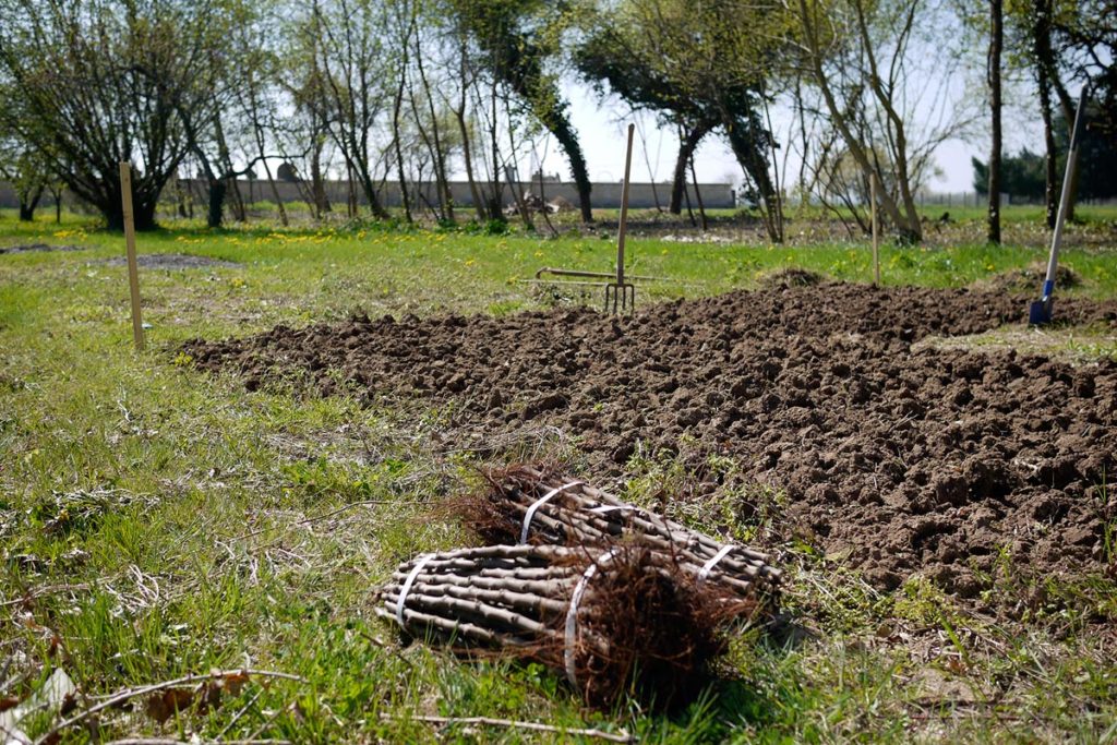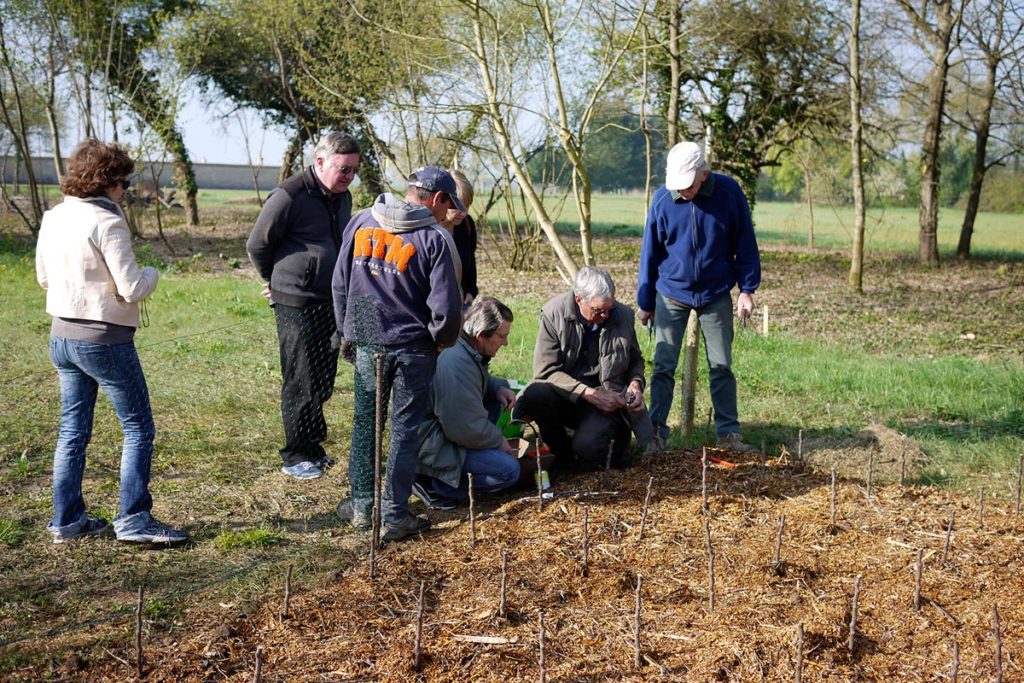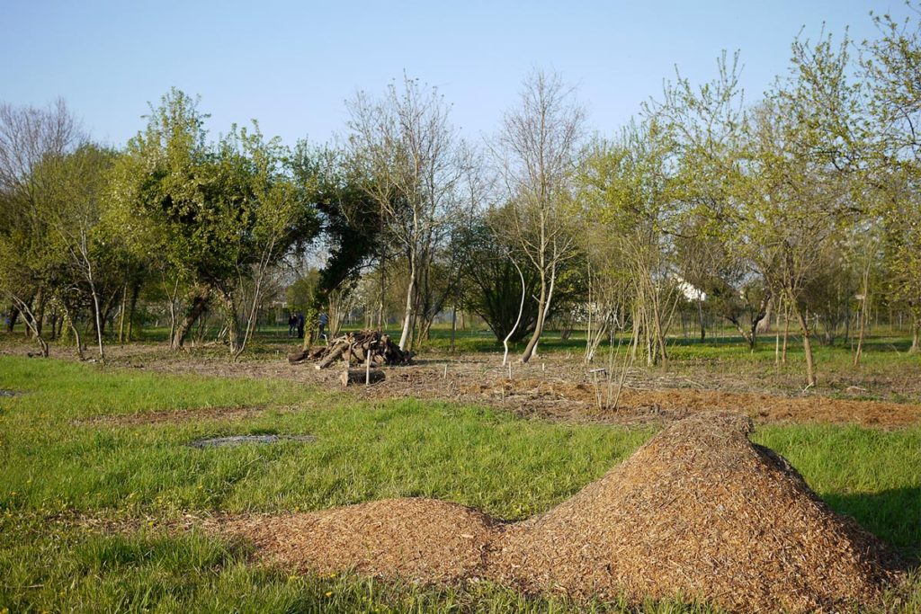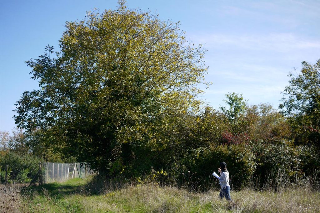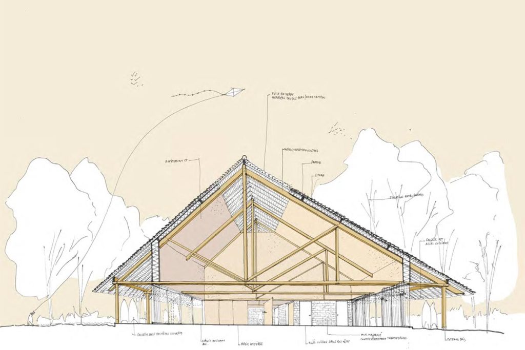 Le site présente une morphologie en lanière, composée de haies à l’état de friche. Ces haies sont ponctuées de nombreux arbres remarquables. Le parti pris est de ménager le site plutôt que de l’aménager. Pour ce faire, nous proposons de conserver la majorité des sujets tout en procédant à leur éclaircissement afin de favoriser la biodiversité et de créer des ouvertures vers la salle polyvalente. Les lisières sont quant à elles traitées en prairies mésophiles. Afin de porter cette approche, des ateliers autour de techniques de gestion différenciée sont en cours avec les agents et les habitants. Cette démarche écologique, sociale et économique, aboutira à l’établissement d’un plan de gestion pour les 10 années à venir.