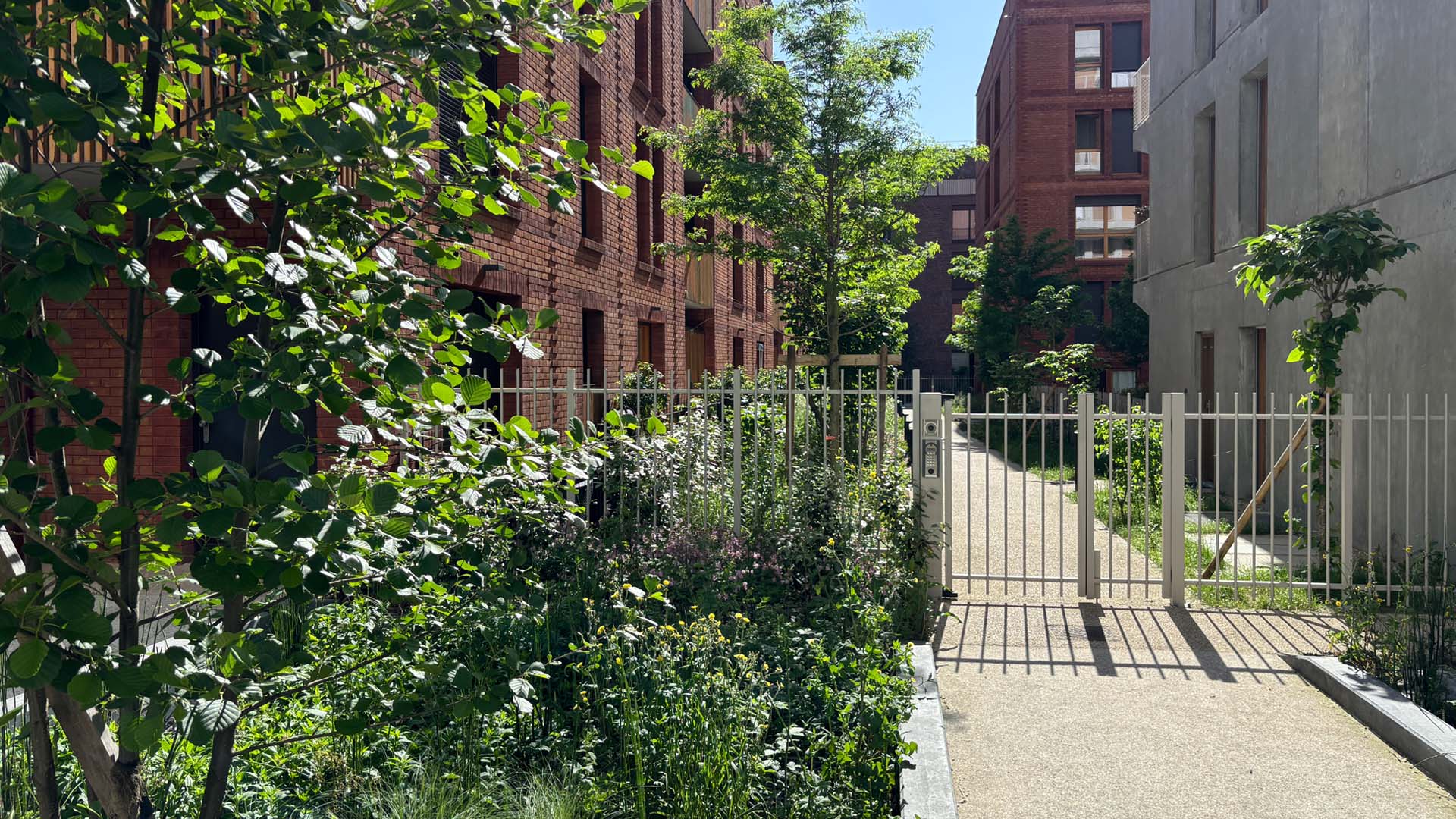 La ZAC Victor Hugo est un quartier mixte d’une vingtaine d’hectares qui s’inscrit dans le territoire contrasté d’entrée de ville de Bagneux, en profonde mutation avec l’arrivée de la ligne n°4 du métro et de la ligne n°15 du Grand Paris Express. Le lot L4 dédié à la construction de logements sociaux est situé au coeur de la ZAC. Le coeur d’îlot paysager est composé d’une allée traversante vers les rues existantes, assurant une percée visuelle et permettant de récolter les eaux pluviales ainsi que d’un jardin partagé étagé. Les 3 terrasses qui composent le jardin permettent de gérer la topographie en étant de plain-pied avec les halls ainsi que de différencier les activités : terrasse haute (espace de convivialité et de partage), terrasse intermédiaire (espace de jardinage et de loisirs), terrasse basse (espace calme et de détente).