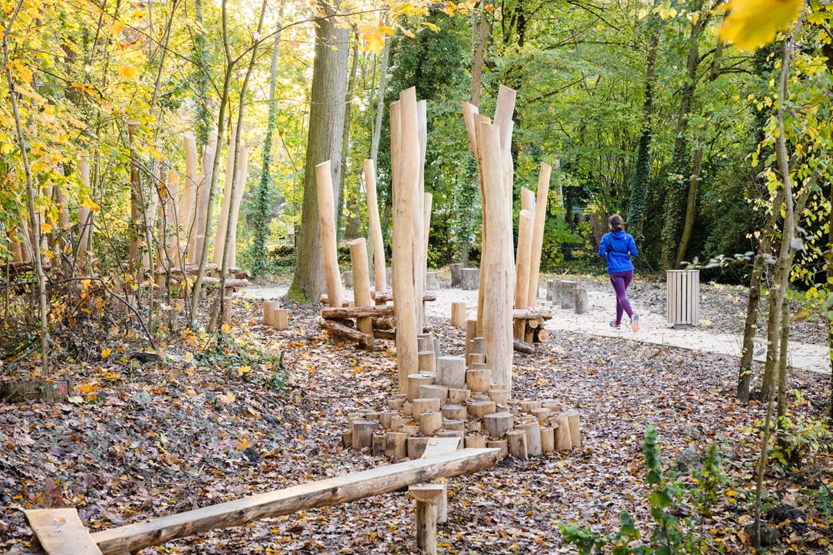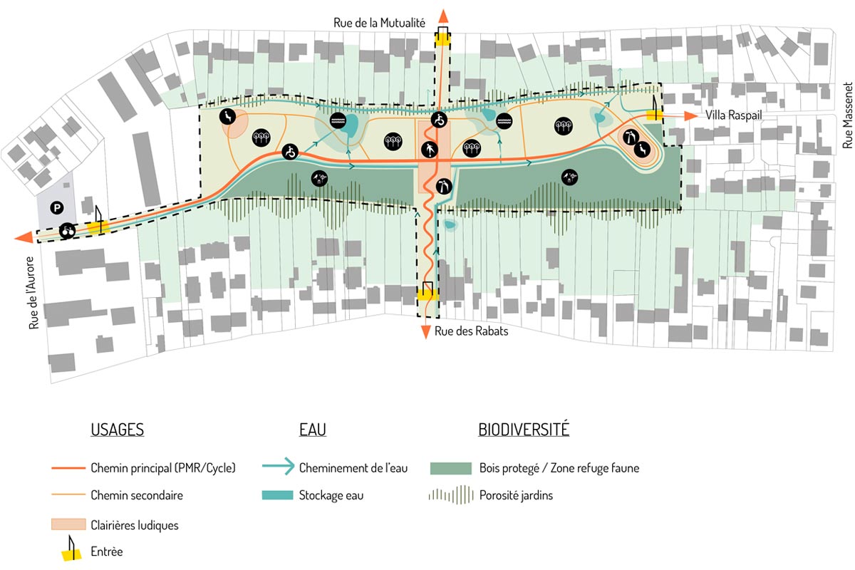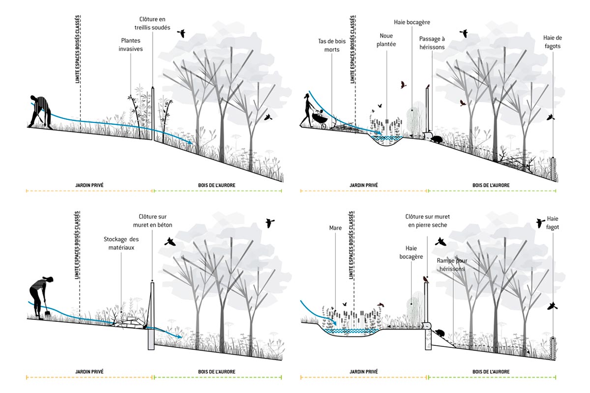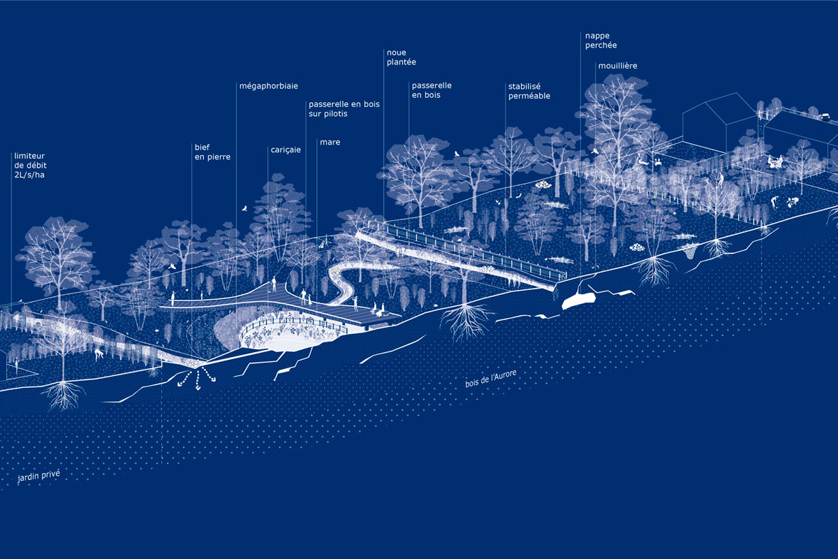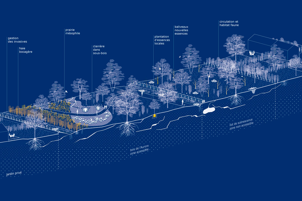 Le bois de l’Aurore s’inscrit dans le quartier pavillonnaire des Rabats, composé de parcelles jardinées en lanières aux limites poreuses. Implanté sur le coteau, il présente une forte déclivité et l’eau y est omniprésente tant en surface qu’en souterrain (mare et nappe perchée). Les récents épisodes pluvieux ont fortement dégradé le bois entraînant l’érosion des cheminements et des inondations. Le projet développe une démarche résiliente par rapport à l’eau afin qu’elle ne soit plus subie mais valorisée sous différentes formes. Des clairières sont aménagées pour faire rentrer la lumière dans le bois. Elles sont propices au développement d’activités ludiques intégrées dans la pente. La lisière avec les jardins privés est travaillée pour permettre la circulation de la faune et créer des zones de refuge.