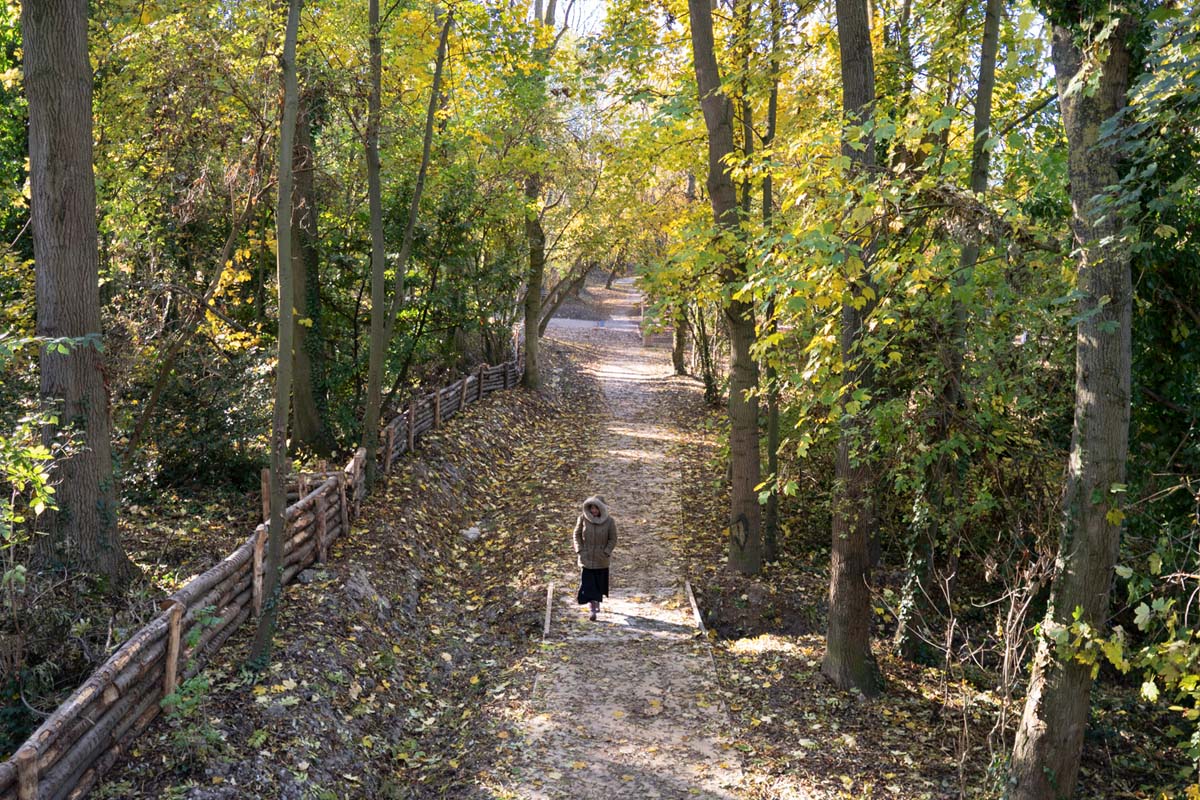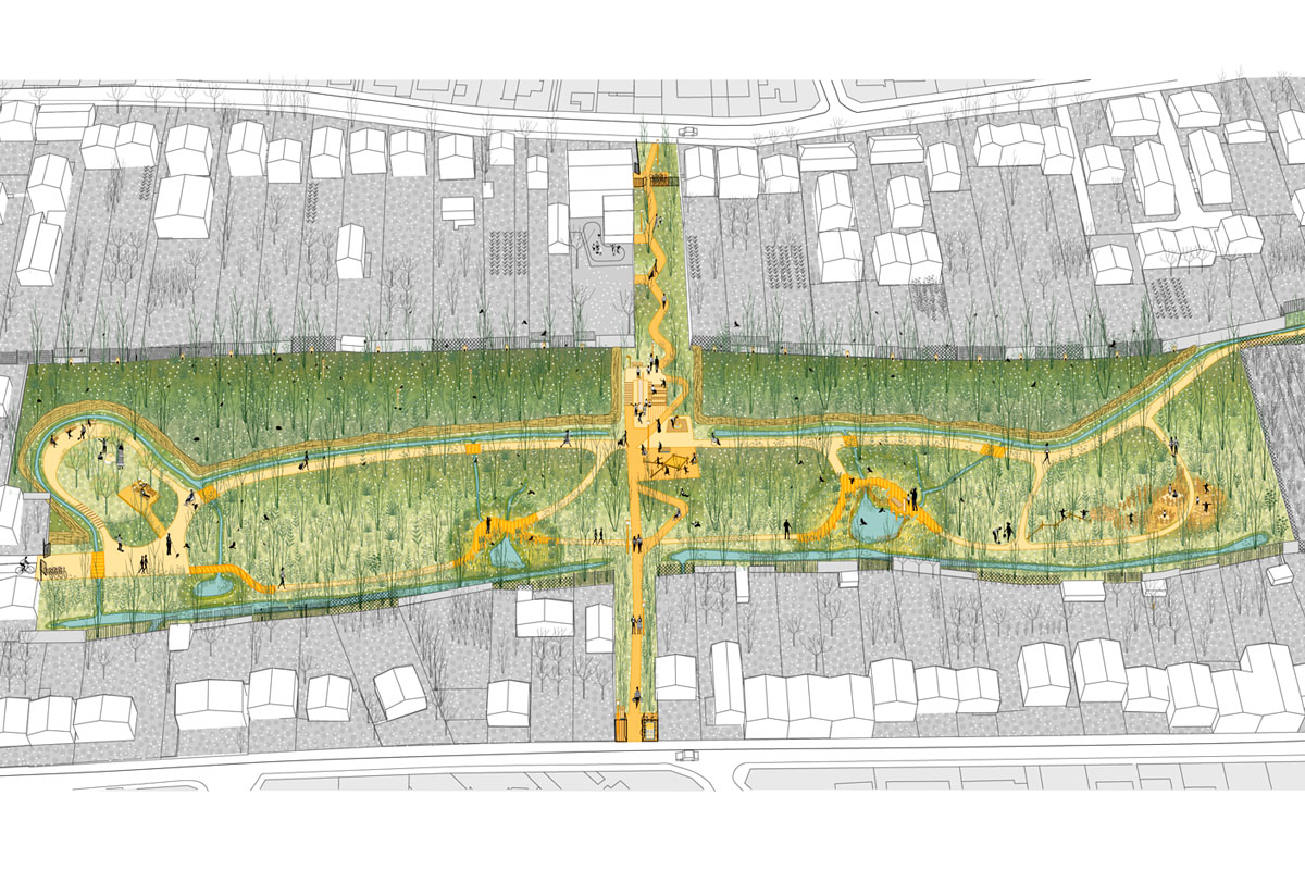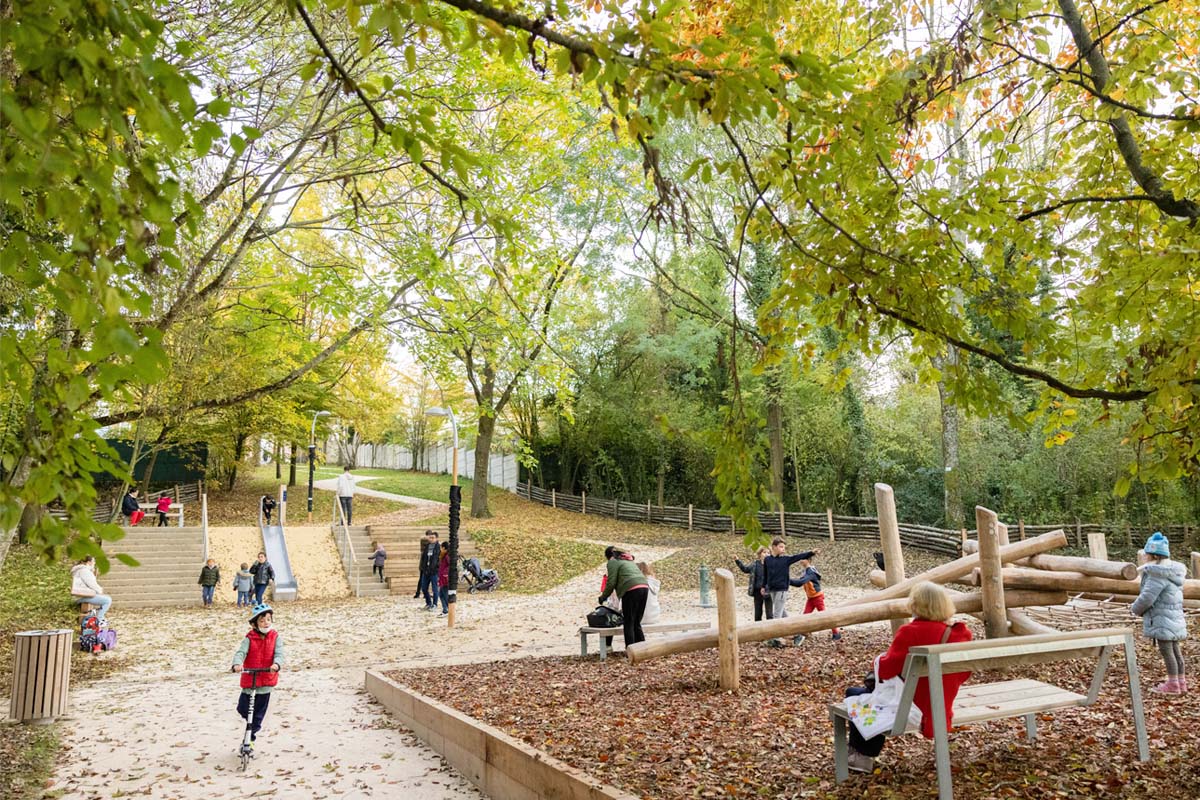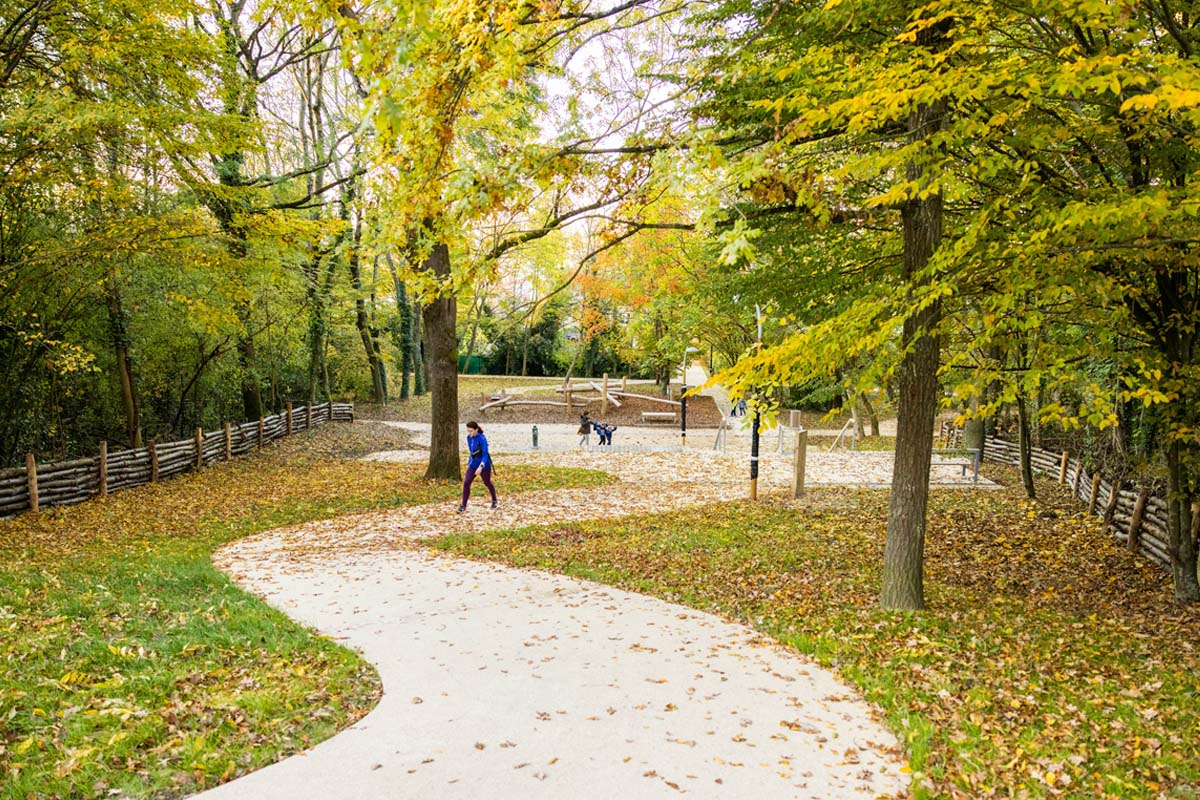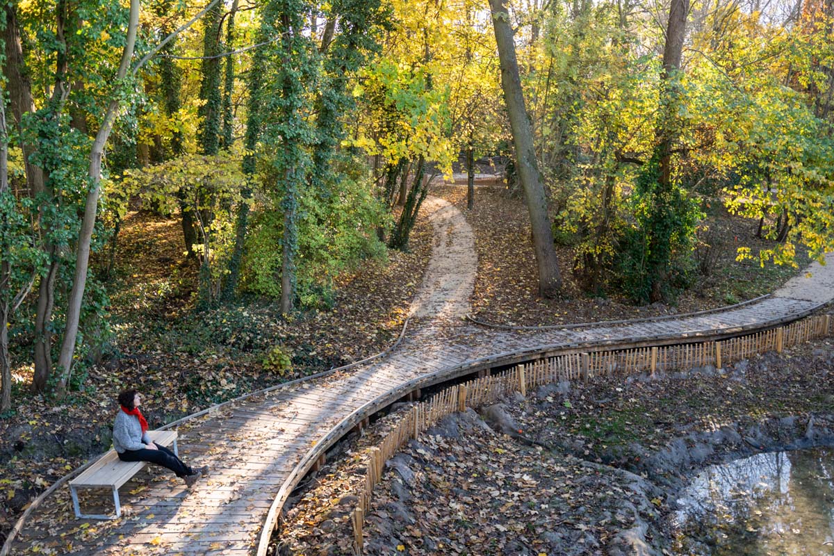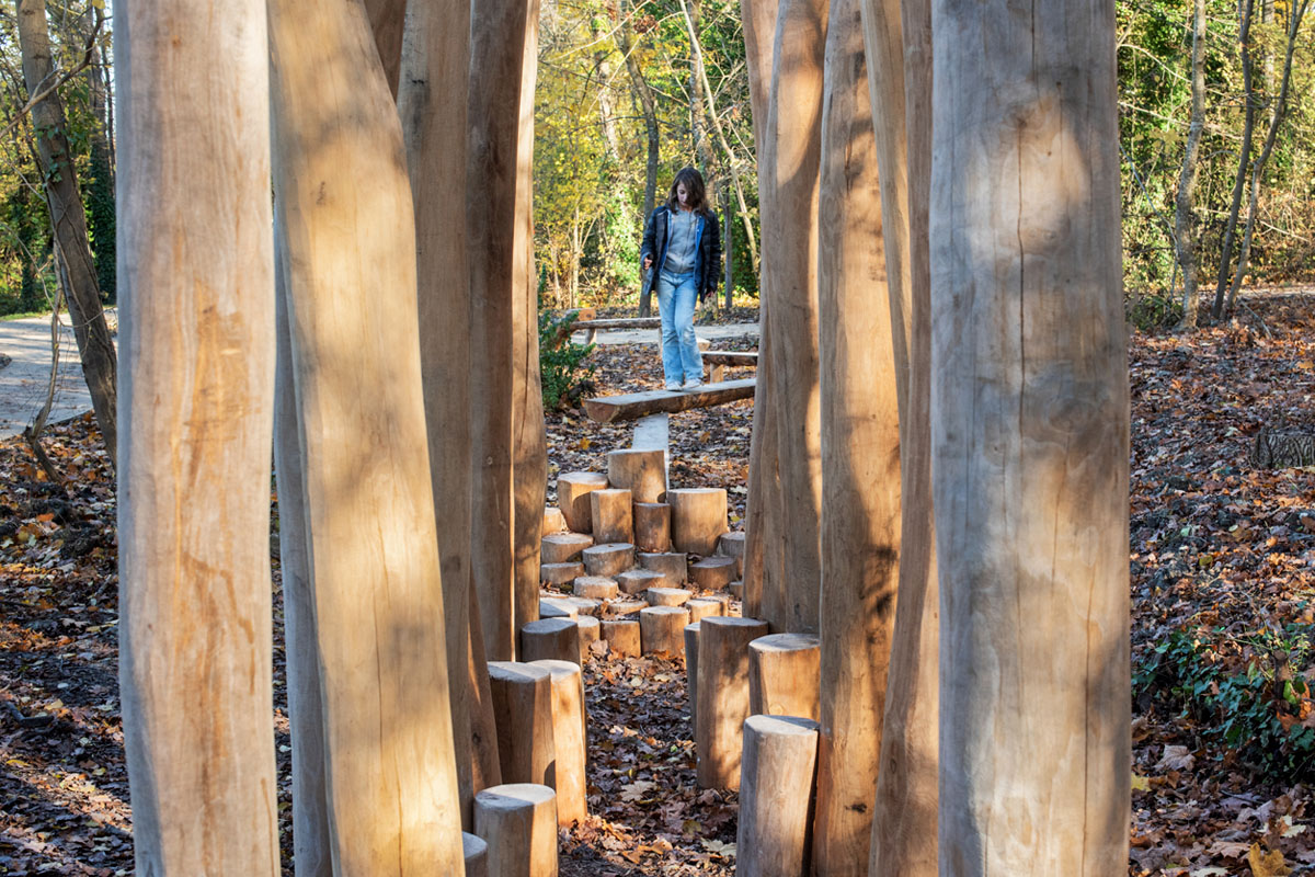 Le bois de l’Aurore s’inscrit dans le quartier pavillonnaire des Rabats, composé de parcelles jardinées en lanières aux limites poreuses. Implanté sur le coteau, il présente une forte déclivité et l’eau y est omniprésente tant en surface qu’en souterrain (mare et nappe perchée). Les récents épisodes pluvieux ont fortement dégradé le bois entraînant l’érosion des cheminements et des inondations. Le projet développe une démarche résiliente par rapport à l’eau afin qu’elle ne soit plus subie mais valorisée sous différentes formes. Des clairières sont aménagées pour faire rentrer la lumière dans le bois. Elles sont propices au développement d’activités ludiques intégrées dans la pente. La lisière avec les jardins privés est travaillée pour permettre la circulation de la faune et créer des zones de refuge.