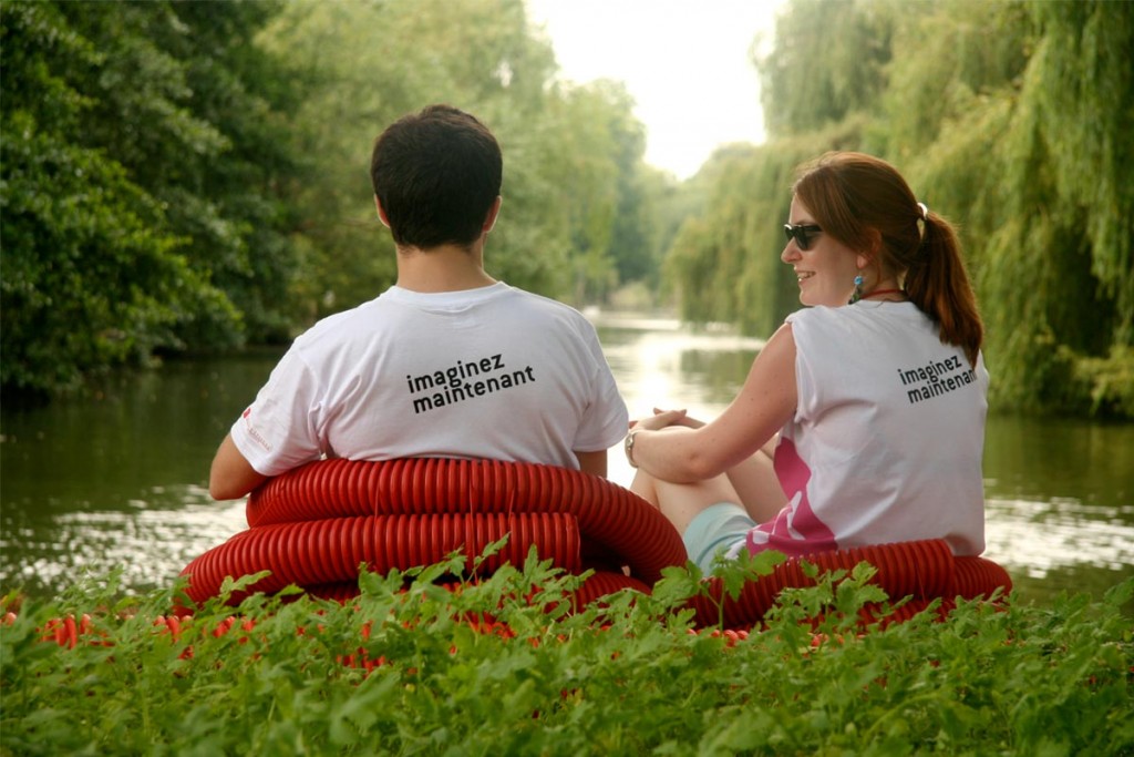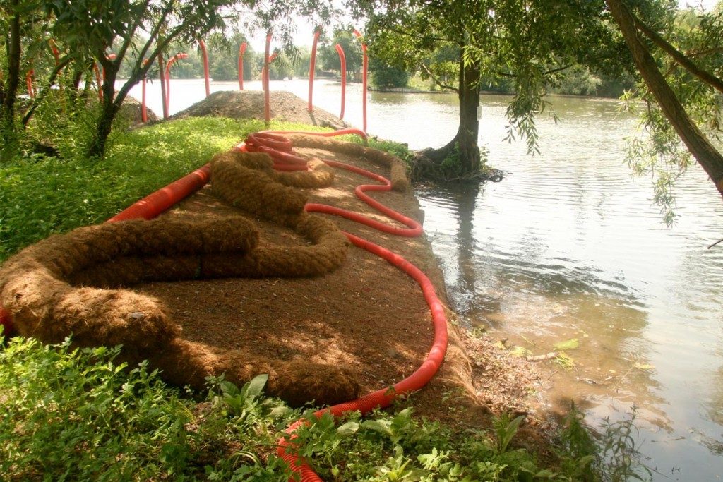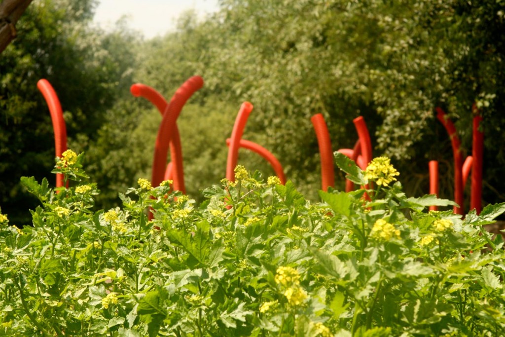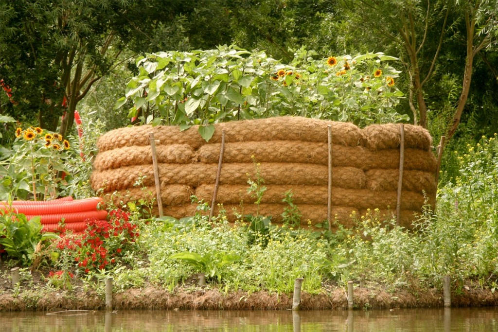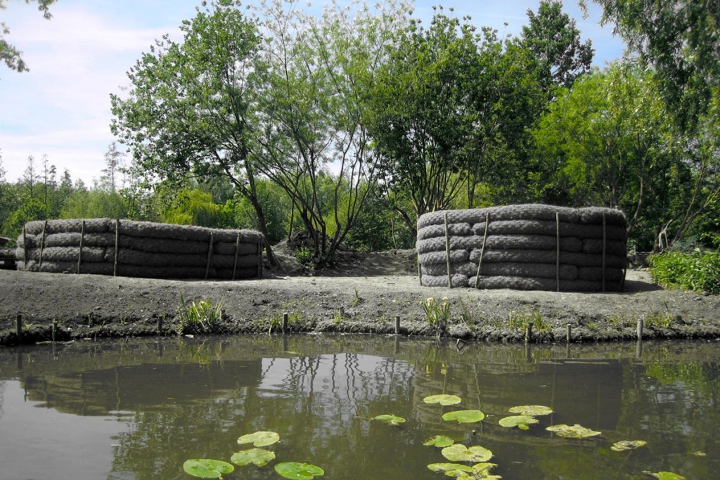 Les hortillonnages sont formés d’un réseau d’îles entourées de canaux alimentés par la Somme. La culture maraîchère constitutive de l’identité de ce paysage a progressivement été abandonnée. A l’occasion du festival “Art, villes et paysages”, nous avons investi une île délaissée servant à stocker la vase curée dans les canaux. Cette vase contient des déchets et la présence de métaux lourds. Notre projet expérimenta différentes techniques pour stabiliser les berges. La vase une fois stockée fut traitée par le biais du processus de phytoremédiation. Une approche ludique et plastique, à l’aide de gaines rouges est venue apporter une touche de couleur et initier le parcours à travers l’île.